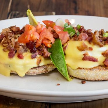 A toasted English muffin topped with cream cheese, poached eggs, avocado, diced tomato, bacon pieces & Hollandaise sauce.