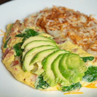 All Omelets are made with 3 fresh eggs and are served with hashbrowns, fruit, or grits and toast, biscuits, or pancakes.